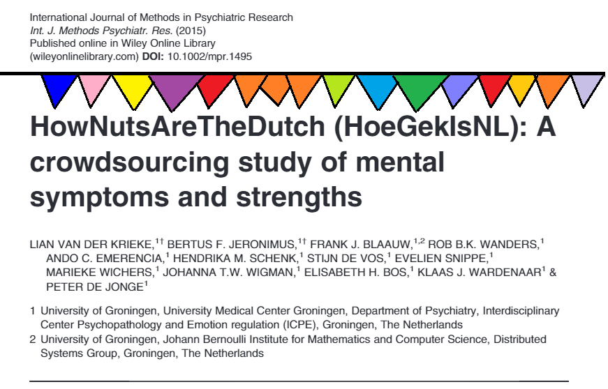 Het overzichtspaper van de HoeGekIsNL studie is gepubliceerd in de wetenschappelijke literatuur. Hierin staat beschreven waarom we HoeGekIsNL zijn begonnen, hoeveel van jullie hebben meegedaan in het eerste jaar, wat we allemaal hebben gemeten, hoe de website werkt, en wat we het komende jaar van plan zijn. Ook staan een paar van de eerste resultaten beschreven. Bijvoorbeeld, dat emoties niet erg verschillen voor mannen en vrouwen. Dat 85% van onze deelnemers gelukkig is (>6 op schaal 0-10). Dat angst meer voorkomt dan depressie. Dat ongeveer 20% van de deelnemers geen gevoelens van angst of depressie ervaart. Dat 5% van de deelnemers ernstige angst of depressie ervaart, maar desondanks een aantal van hen toch ook gelukkig zegt te zijn. We zijn een serie artikelen aan het uitwerken waarin we onderzoeken hoe dit komt. Zodra ze gepubliceerd zijn hoort u meer.